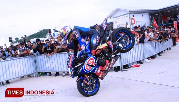 TIMES Padang/Pembalap PATA Yamaha Brixx Toprak Razgatlioglu melakukan atraksi stopie ban depan usai memenangi race 1 WSBK Mandalika 2022, Sabtu (12/11/2022). (FOTO: Tria Adha/TIMES Indonesia).