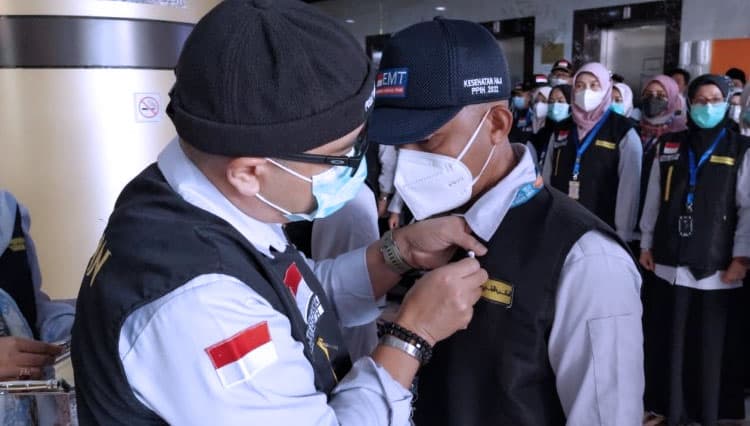 TIMES Padang/Kapuskes Haji Kemenkes Budi Sylvana saat menyematkan pin kepada petugas kesehatan haji. (FOTO: dok. Kemenkes)